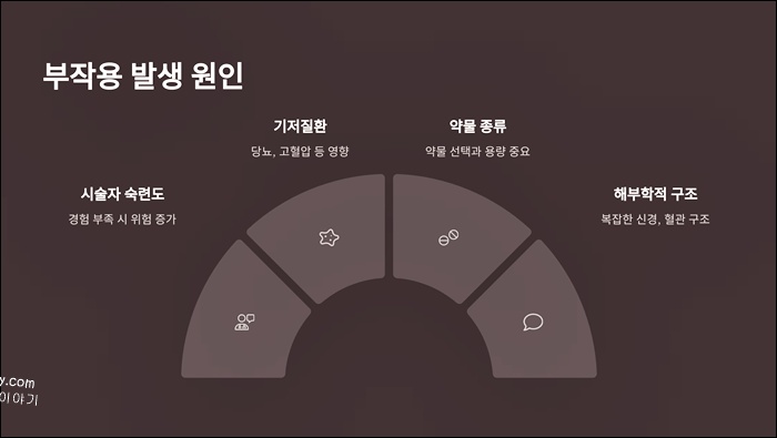 목 신경차단술 부작용은 여러 원인에 의해 발생할 수 있습니다. 시술자의 숙련도가 부족하면 신경이나 혈관 손상, 약물 오주입 위험이 높아집니다. 당뇨, 고혈압, 혈액응고장애 등 기저질환이 있는 경우 부작용 위험이 증가할 수 있습니다. 약물 종류와 용량, 경추 해부학적 구조도 영향을 미치며, 특히 목 부위는 신경과 혈관이 복잡하게 얽혀 있어 더욱 주의가 필요합니다. 시술 전 환자 상태를 충분히 평가하고, 적합한 약물과 용량을 선택하는 것이 중요합니다.