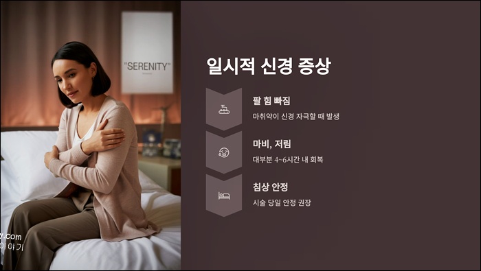 실제 환자 사례에 따르면, 목 신경차단술 후 팔의 힘이 빠지거나, 이명, 어지러움, 사각근 통증 등 다양한 증상이 나타날 수 있습니다. 대부분은 일시적이지만, 드물게 장기간 지속되거나 새로운 증상이 발생할 수 있습니다. 국내 통증클리닉 환자 100명 중 약 10명(10%) 정도가 일시적 신경 증상이나 마취 부작용을 경험한다는 통계가 있습니다. 하지만 대부분은 1~2일 이내 자연 회복되며, 심각한 합병증은 1% 미만으로 보고됩니다.