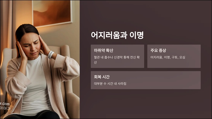 마취약이 혈관 내로 흡수되거나 신경막을 통해 일부가 전신으로 퍼질 때 어지러움, 이명, 구토, 오심 등의 증상이 나타날 수 있습니다. 심한 경우 혈압이 떨어지거나 일시적으로 의식을 잃을 수 있으나, 대부분 수 시간 내로 사라집니다. 이런 증상은 시술 후 병원에서 15~30분 정도 관찰하면 조기에 발견할 수 있습니다.